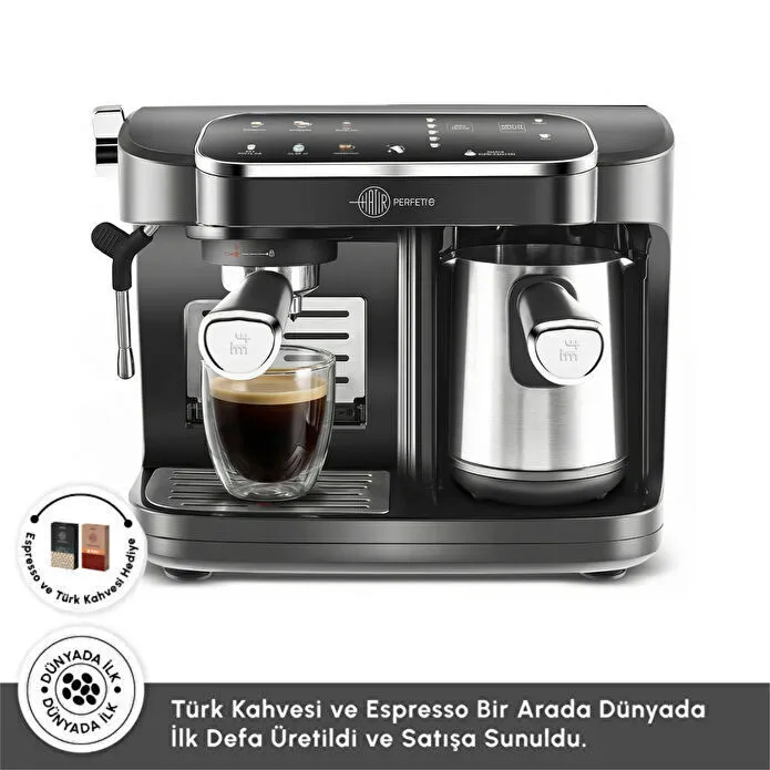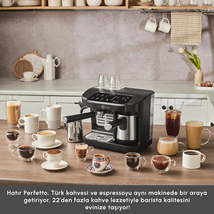 دستگاه Hatır Perfetto که هم تجربه یک دستگاه اسپرسوساز و هم یک دستگاه قهوه ترک را ارائه میدهد ، میتواند همزمان اسپرسو دم کند و قهوه ترک کفدار را روی زغال آماده کند.