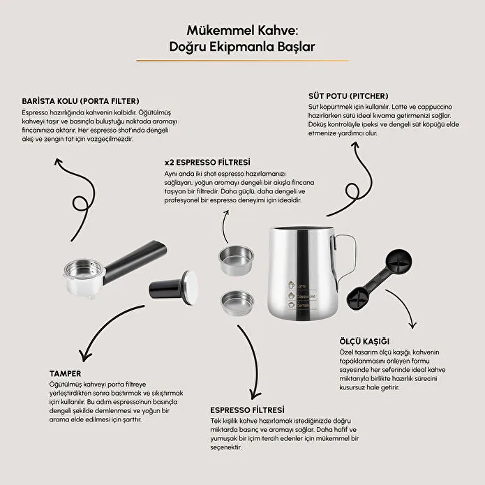 دستگاه قهوه ساز کاراجا هاتیر پرفتو (Karaca Hatır Perfetto) با لوازم جانبی ویژه برای تهیه قهوه با کیفیت باریستا در خانه ارائه میشود. فیلتر باریستا پورتا (barista porta filter) موجود در دستگاه به شما امکان میدهد اسپرسو را با جریان حرفهای تهیه کنید ، در حالی که ظرف شیر ، تجربه بینظیر کف کردن قهوه برای لاته و کاپوچینو را فراهم میکند. تمپر (tamper) با فشار دادن اسپرسو تا رسیدن به سفتی ایدهآل ، کیفیت آن را افزایش میدهد.