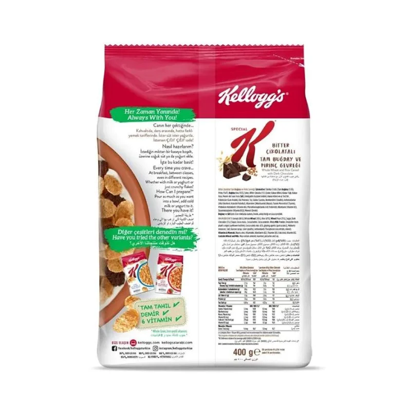 نام محصول : Kellogg’s Special K Bitter Çikolatalı Kahvaltılık Tam Buğday Ve Pirinç Gevreği 400 Gr,tam Tahıllı